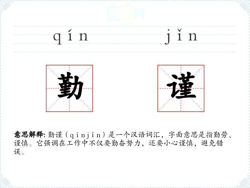 勤谨(qín jǐn)是一个汉语词汇,字面意思是指勤劳、谨慎。它强调在工作中不仅要勤奋努力,还要小心谨慎,避免错误。