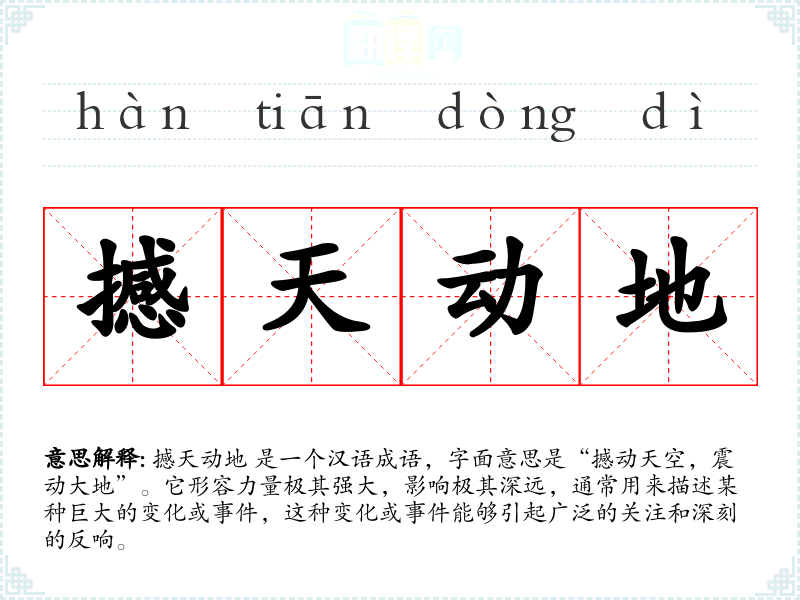 撼天动地 这个成语源自**古代文学和哲学,其使用可以追溯到古代文献。随着时间的推移,这个成语的含义和用法逐渐固定,成为描述巨大影响力的常用表达。