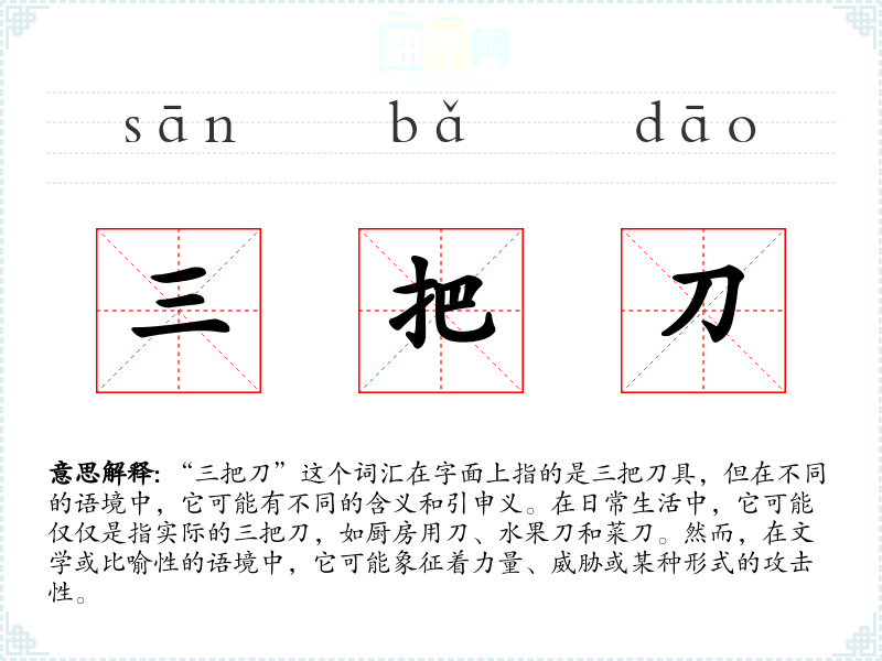 - 反义词:三盾、三甲(这些词汇与“三把刀”形成对比,代表防御而非攻击)。