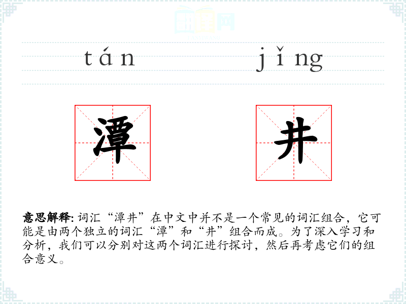 词汇“潭井”在中文中并不是一个常见的词汇组合,它可能是由两个独立的词汇“潭”和“井”组合而成。为了深入学*和分析,我们可以分别对这两个词汇进行探讨,然后再考虑它们的组合意义。