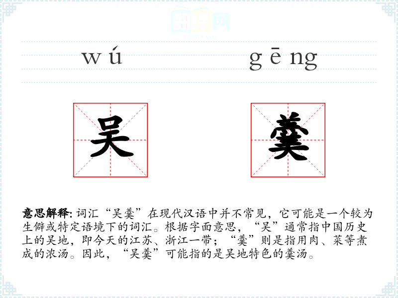 “吴羹”的字面意思是指吴地(江苏、浙江一带)特色的羹汤,可能是一种具有地方特色的美食。