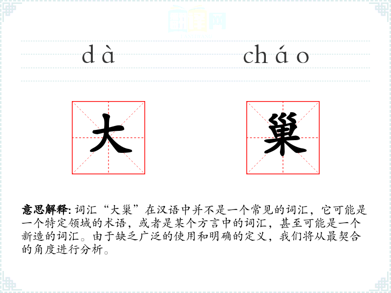 由于“大巢”不是一个常用词汇,它的词源和演变可能不为人所熟知。它可能是由“大”和“巢”两个字组合而成,直接表达了大小和巢穴的概念。