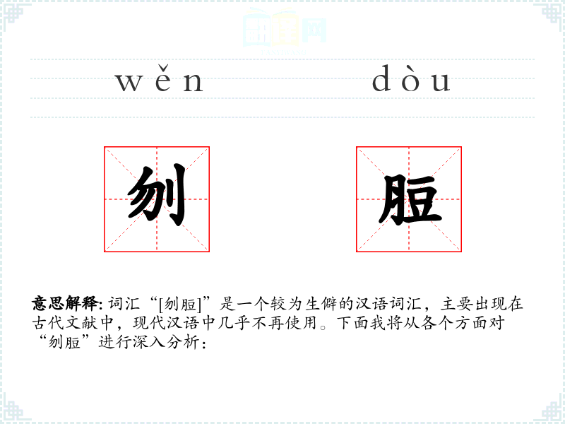 词汇“[刎脰]”是一个较为生僻的汉语词汇,主要出现在古代文献中,现代汉语中几乎不再使用。下面我将从各个方面对“刎脰”进行深入分析: