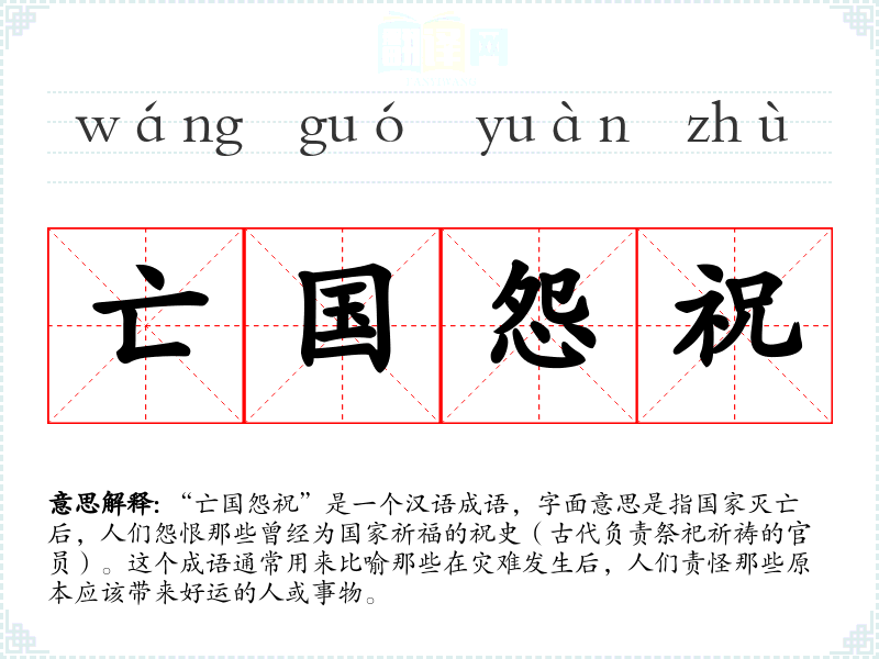 “亡国怨祝”是一个汉语成语,字面意思是指国家灭亡后,人们怨恨那些曾经为国家祈福的祝史(古代负责祭祀祈祷的官员)。这个成语通常用来比喻那些在灾难发生后,人们责怪那些原本应该带来好运的人或事物。