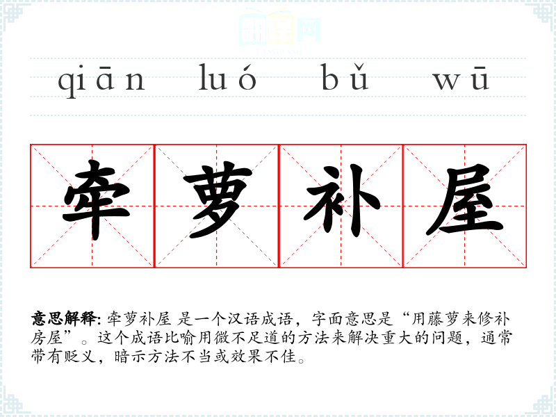 牵萝补屋 是一个汉语成语,字面意思是“用藤萝来修补房屋”。这个成语比喻用微不足道的方法来解决重大的问题,通常带有贬义,暗示方法不当或效果不佳。