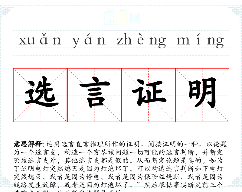 1.运用选言直言推理所作的证明。间接证明的一种。以论题为一个选言支,构造一个穷尽该问题一切可能的选言判断,并断定除该选言支外,其他选言支都是假的,从而断定论题是真的。如为了证明电灯突然熄灭是因为灯泡坏了,可以构造选言判断如下电灯突然熄灭,或者是因为停电,或者是因为保险丝烧断,或者是因为线路发生故障,或者是因为灯泡坏了。”然后根据事实断定前三个选言支为假,从而断定论题是真的。