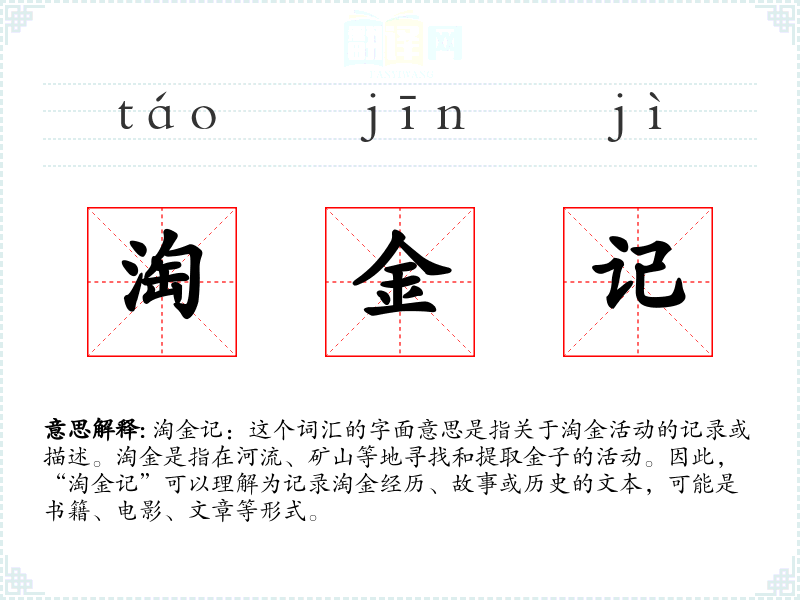 淘金记:这个词汇的字面意思是指关于淘金活动的记录或描述。淘金是指在河流、矿山等地寻找和提取金子的活动。因此,“淘金记”可以理解为记录淘金经历、故事或历史的文本,可能是书籍、电影、文章等形式。