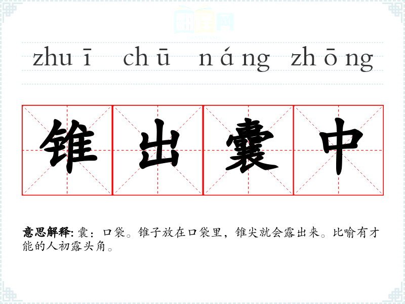 囊:口袋。锥子放在口袋里,锥尖就会露出来。比喻有才能的人