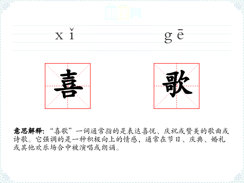 “喜歌”一词通常指的是表达喜悦、庆祝或赞美的歌曲或诗歌。它强调的是一种积极向上的情感,通常在节日、庆典、婚礼或其他欢乐场合中被演唱或朗诵。
