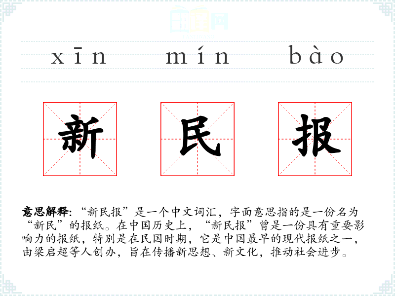 同义词可能包括“进步报”、“启蒙报”等,这些词汇都强调了报纸的进步性和启蒙作用。反义词可能较难找到,因为“新民报”本身具有特定的历史和文化含义。