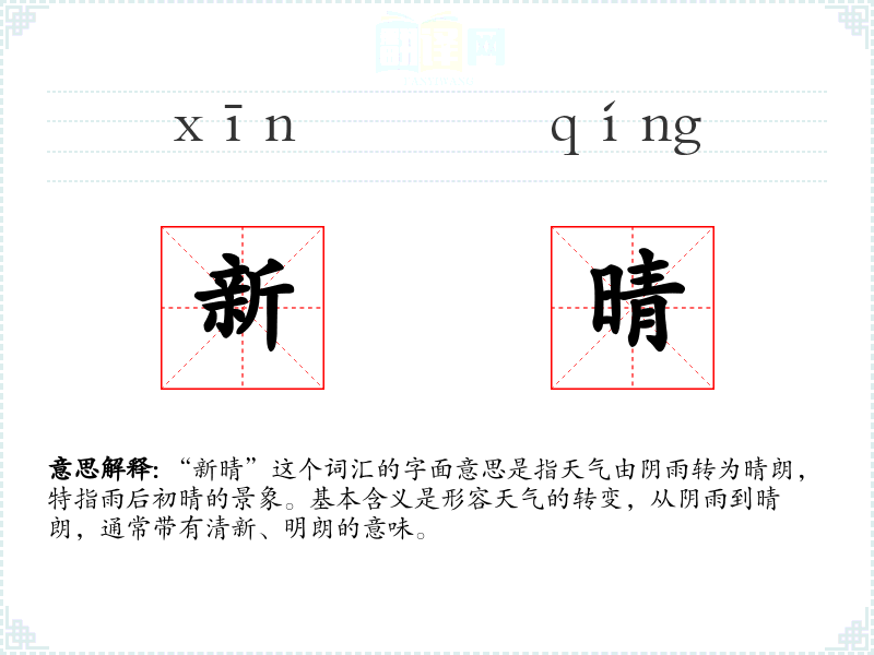 “新晴”这个词汇的字面意思是指天气由阴雨转为晴朗,特指雨后初晴的景象。基本含义是形容天气的转变,从阴雨到晴朗,通常带有清新、明朗的意味。