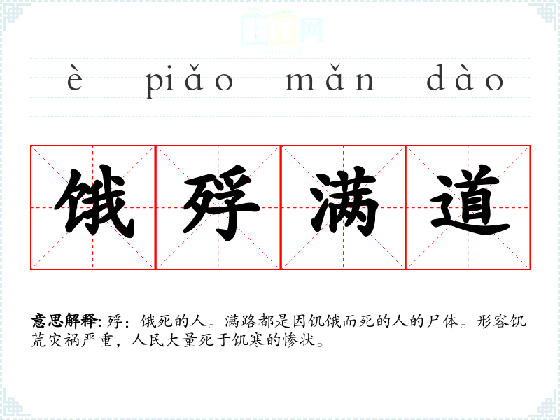 殍:饿死的人。满路都是因饥饿而死的人的尸体。形容饥荒灾祸严重,人民大量死于饥寒的惨状。