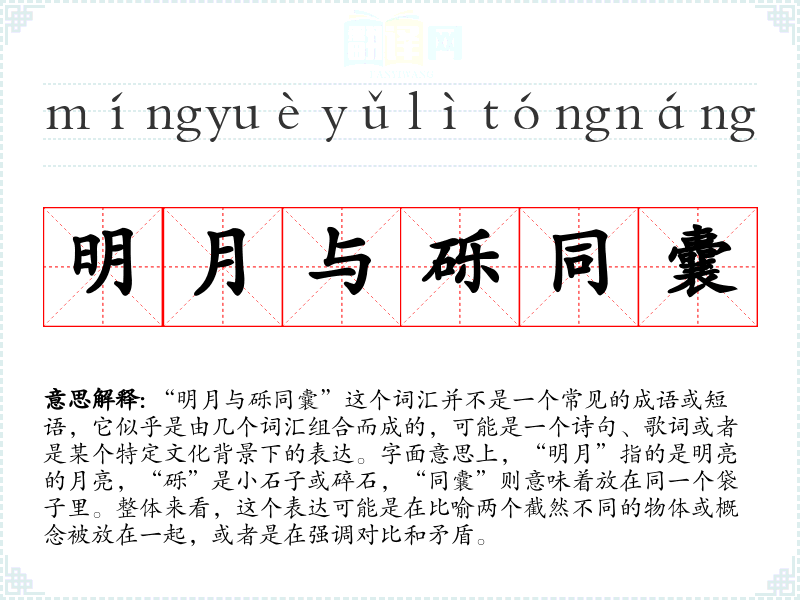 “明月与砾同囊”这个词汇由于其不确定性,可能需要在特定的文学或文化背景中才能得到充分的理解和应用。在语言学习和表达中,它可能是一个有趣的比喻或者是创造意境的工具。