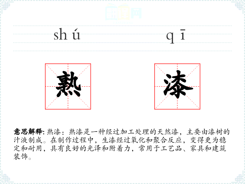 - 反义词:生漆(未经过处理的天然漆,质地较软,易变质)