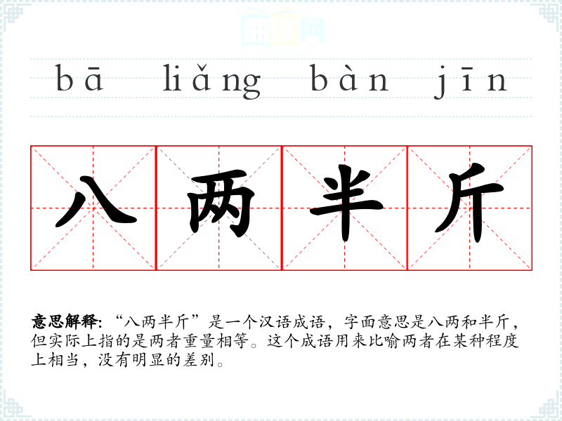 “八两半斤”是一个汉语成语,字面意思是八两和半斤,但实际上指的是两者重量相等。这个成语用来比喻两者在某种程度上相当,没有明显的差别。