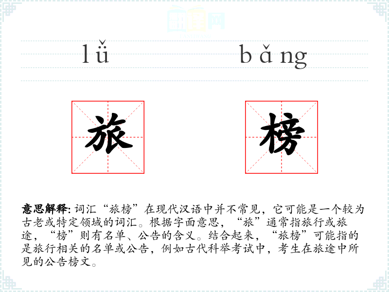 - 专业领域:在历史学或古代科举制度的研究中,可能会提及“旅榜”这一概念。
