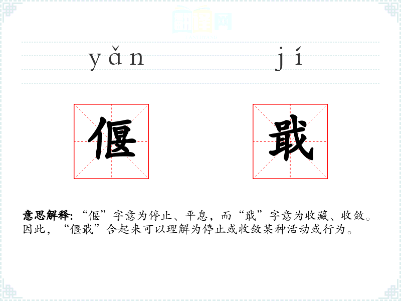 “偃”字意为停止、平息,而“戢”字意为收藏、收敛。因此,“偃戢”合起来可以理解为停止或收敛某种活动或行为。