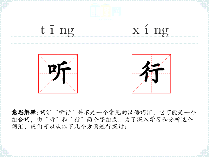 词汇“听行”并不是一个常见的汉语词汇,它可能是一个组合词,由“听”和“行”两个字组成。为了深入学习和分析这个词汇,我们可以从以下几个方面进行探讨: