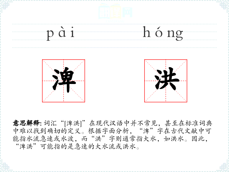 词汇“[渒洪]”在现代汉语中并不常见,甚至在标准词典中难以找到确切的定义。根据字面分析,“渒”字在古代文献中可能指水流急速或水波,而“洪”字则通常指大水,如洪水。因此,“渒洪”可能指的是急速的大水流或洪水。