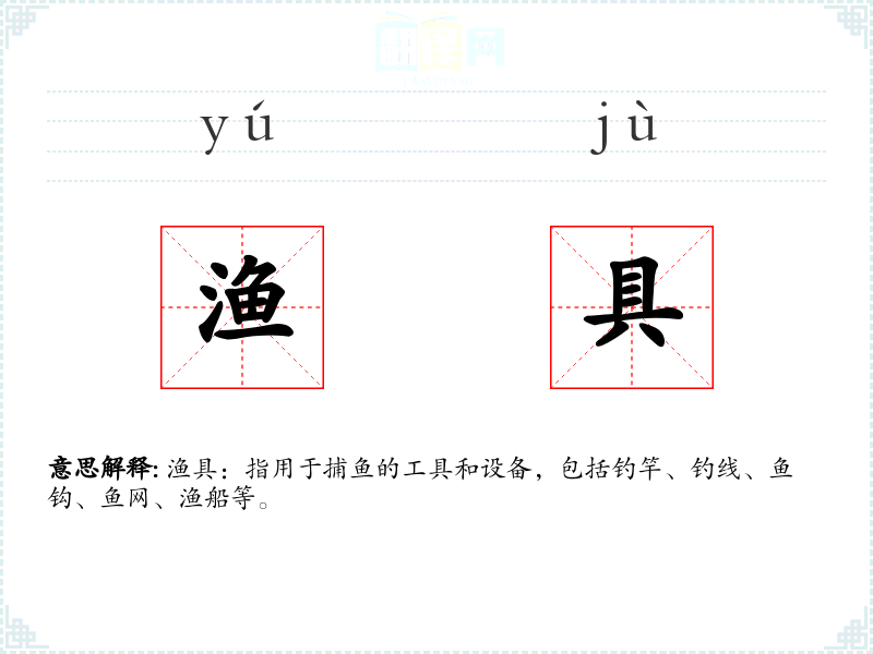 - 反义词:无(渔具本身是一个具体的工具类别,没有直接的反义词)