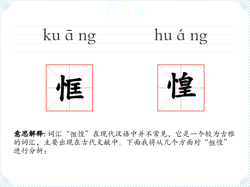 词汇“恇惶”在现代汉语中并不常见,它是一个较为古雅的词汇,主要出现在古代文献中。下面我将从几个方面对“恇惶”进行分析: