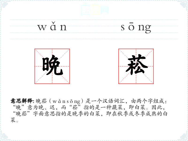 晩菘(wǎn sōng)是一个汉语词汇,由两个字组成:“晩”意为晚、迟,而“菘”指的是一种蔬菜,即白菜。因此,“晩菘”字面意思指的是晚季的白菜,即在秋季或冬季成熟的白菜。