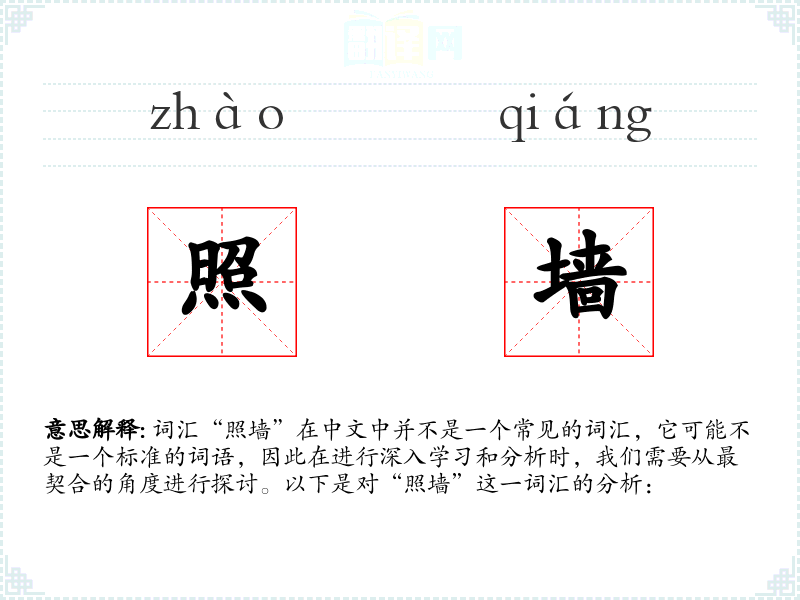 词汇“照墙”在中文中并不是一个常见的词汇,它可能不是一个标准的词语,因此在进行深入学习和分析时,我们需要从最契合的角度进行探讨。以下是对“照墙”这一词汇的分析:
