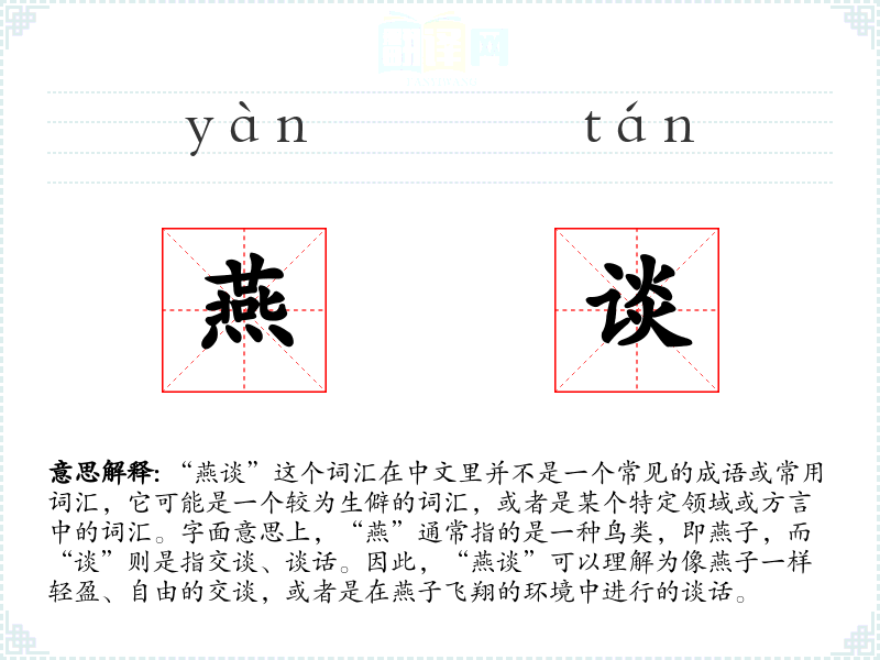 由于“燕谈”不是一个常见的词汇,它在不同语言或文化中的对应词汇可能不太明确。如果要在其他语言中寻找类似的表达,可能需要考虑该语言中对燕子和交谈的特定表达方式。