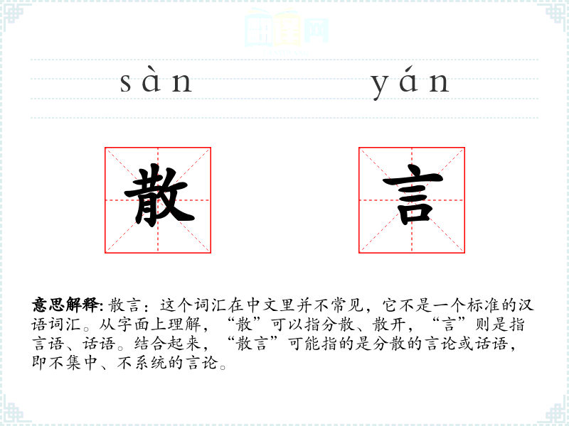 散言:这个词汇在中文里并不常见,它不是一个标准的汉语词汇。从字面上理解,“散”可以指分散、散开,“言”则是指言语、话语。结合起来,“散言”可能指的是分散的言论或话语,即不集中、不系统的言论。