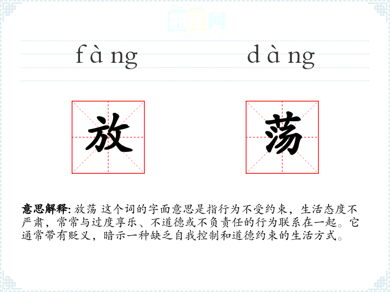 放荡 这个词的字面意思是指行为不受约束,生活态度不严肃,常常与过度享乐、不道德或不负责任的行为联系在一起。它通常带有贬义,暗示一种缺乏自我控制和道德约束的生活方式。