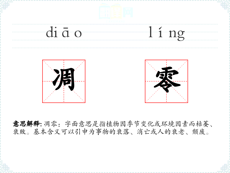 凋零:字面意思是指植物因季节变化或环境因素而枯萎、衰败。基本含义可以引申为事物的衰落、消亡或人的衰老、颓废。