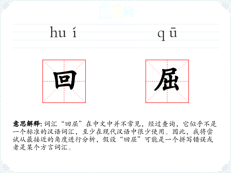 词汇“回屈”在中文中并不常见,经过查询,它似乎不是一个标准的汉语词汇,至少在现代汉语中很少使用。因此,我将尝试从最接近的角度进行分析,假设“回屈”可能是一个拼写错误或者是某个方言词汇。