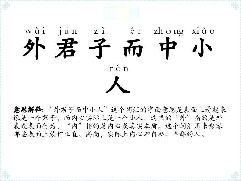 “外君子而中小人”这个词汇的字面意思是表面上看起来像是一个君子,而内心实际上是一个小人。这里的“外”指的是外表或表面行为,“内”指的是内心或真实本质。这个词汇用来形容那些表面上装作正直、高尚,实际上内心却自私、卑鄙的人。