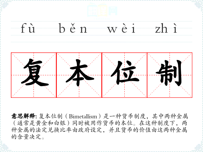 复本位制(Bimetallism)是一种货币制度,其中两种金属(通常是黄金和白银)同时被用作货币的本位。在这种制度下,两种金属的法定兑换比率由政府设定,并且货币的价值由这两种金属的含量决定。