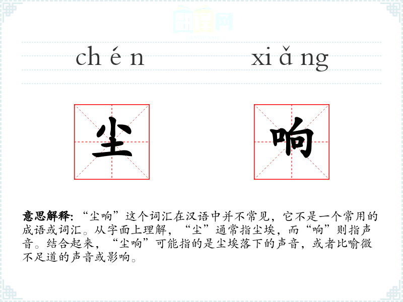 由于“尘响”不是一个常用词汇,它在不同语言或文化中的对应词汇可能不太明确。在英语中,可能没有直接对应的词汇,但可以用“faint sound”或“subtle noise”来描述类似的概念。