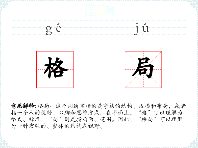 格局:这个词通常指的是事物的结构、规模和布局,或者指一个人的视野、心胸和思维方式。在字面上,“格”可以理解为格式、标准,“局”则是指局面、范围。因此,“格局”可以理解为一种宏观的、整体的结构或视野。
