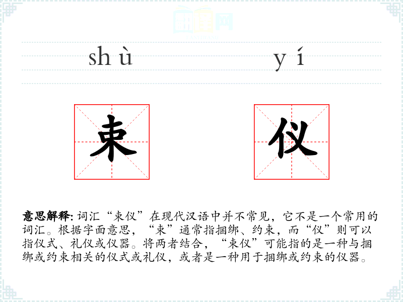 词汇“束仪”在现代汉语中并不常见,它不是一个常用的词汇。根据字面意思,“束”通常指捆绑、约束,而“仪”则可以指仪式、礼仪或仪器。将两者结合,“束仪”可能指的是一种与捆绑或约束相关的仪式或礼仪,或者是一种用于捆绑或约束的仪器。