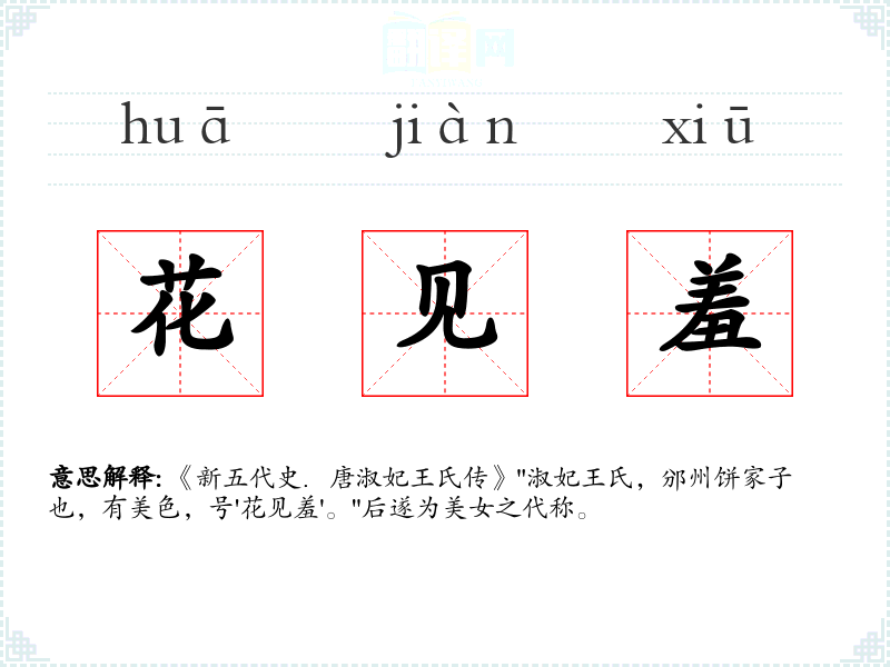 《新五代史.唐淑妃王氏传》"淑妃王氏,邠州饼家子也,有美色,号'花见羞'。"后遂为美女之代称。