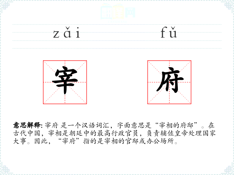 - 专业领域:在历史学或政治学领域,“宰府”可能被用来具体指代某个朝代的宰相官邸或行政中心。