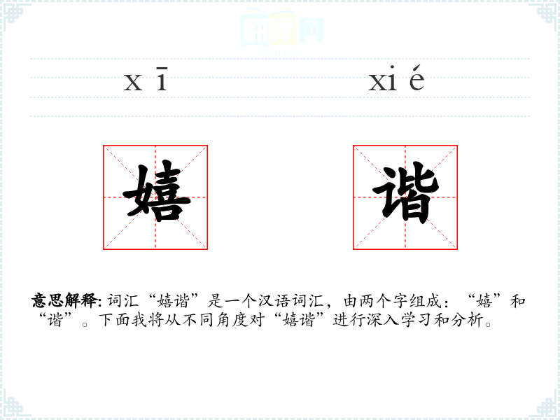 “嬉谐”的字面意思是轻松愉快、幽默诙谐。它通常用来形容言语或行为中的幽默、风趣,以及在社交场合中的一种轻松愉快的氛围。