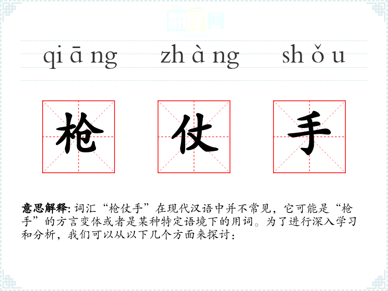 “枪仗手”这个词虽然在现代汉语中不常见,但它反映了语言的多样性和特定语境下的用词惯。在语言学和表达中,了解这样的词汇有助于丰富词汇量和理解语言的多样性。