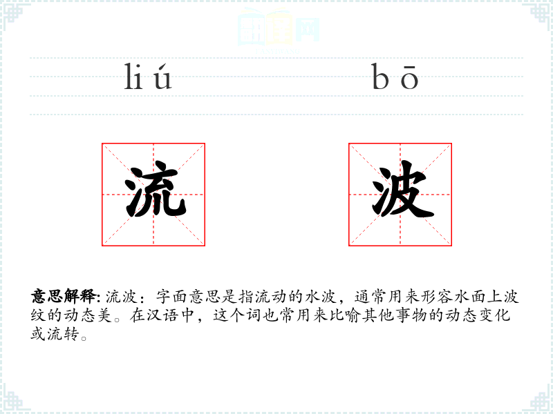 流波:字面意思是指流动的水波,通常用来形容水面上波纹的动态美。在汉语中,这个词也常用来比喻其他事物的动态变化或流转。