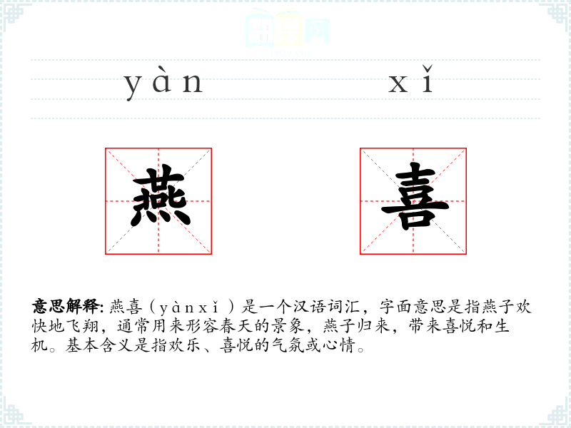 燕喜(yàn xǐ)是一个汉语词汇,字面意思是指燕子欢快地飞翔,通常用来形容春天的景象,燕子归来,带来喜悦和生机。基本含义是指欢乐、喜悦的气氛或心情。