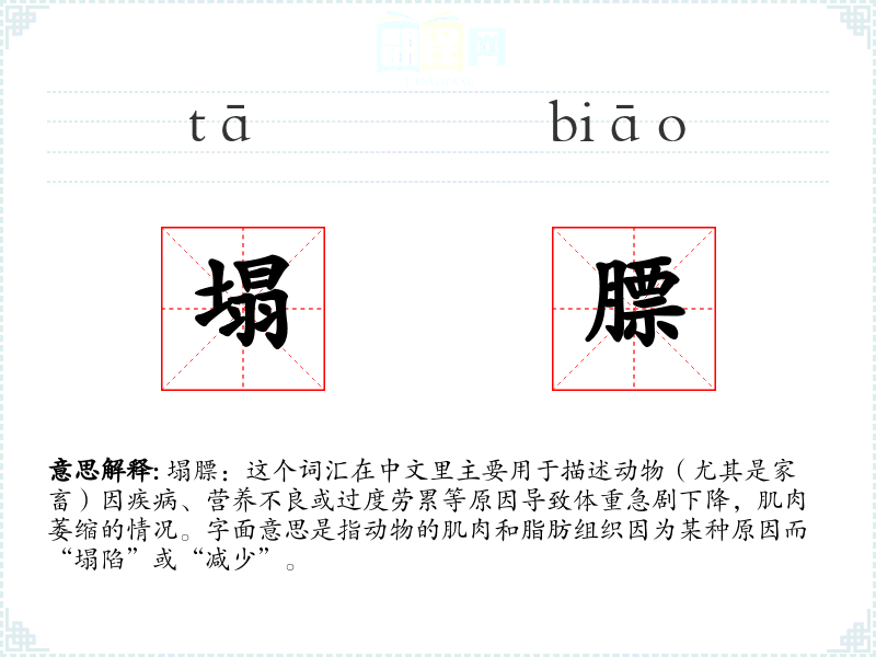 塌膘:这个词汇在中文里主要用于描述动物(尤其是家畜)因疾病、营养不良或过度劳累等原因导致体重急剧下降,肌肉萎缩的情况。字面意思是指动物的肌肉和脂肪组织因为某种原因而“塌陷”或“减少”。