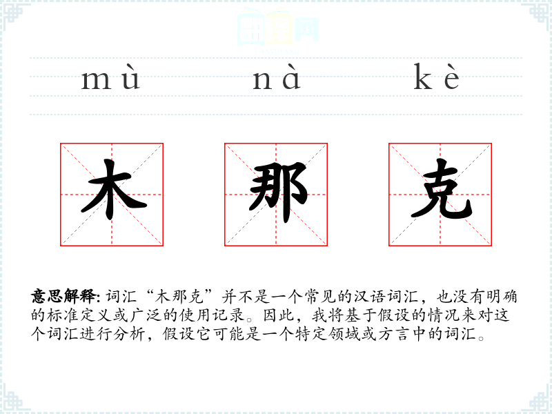 词汇“木那克”并不是一个常见的汉语词汇,也没有明确的标准定义或广泛的使用记录。因此,我将基于假设的情况来对这个词汇进行分析,假设它可能是一个特定领域或方言中的词汇。