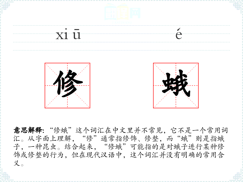 “修蛾”这个词汇在中文里并不常见,它不是一个常用词汇。从字面上理解,“修”通常指修饰、修整,而“蛾”则是指蛾子,一种昆虫。结合起来,“修蛾”可能指的是对蛾子进行某种修饰或修整的行为,但在现代汉语中,这个词汇并没有明确的常用含义。