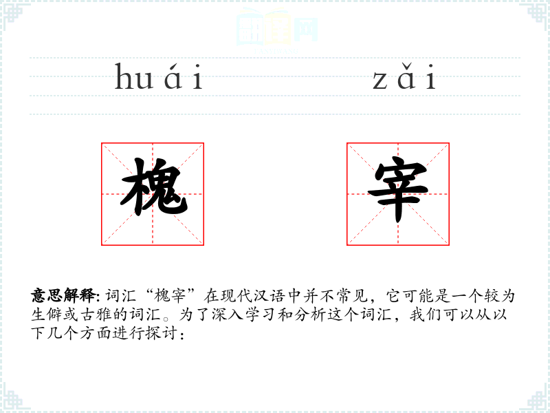 词汇“槐宰”在现代汉语中并不常见,它可能是一个较为生僻或古雅的词汇。为了深入学*和分析这个词汇,我们可以从以下几个方面进行探讨: