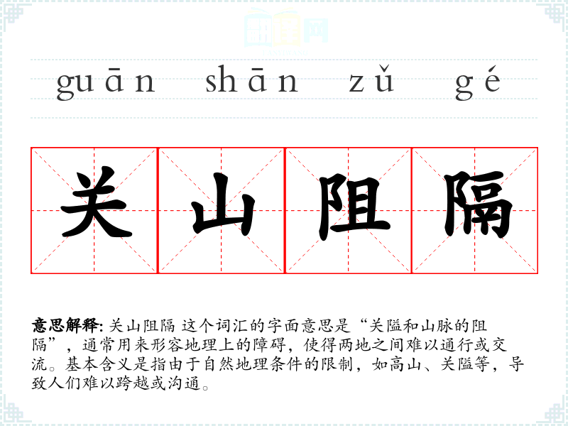 关山阻隔 这个词汇的字面意思是“关隘和山脉的阻隔”,通常用来形容地理上的障碍,使得两地之间难以通行或交流。基本含义是指由于自然地理条件的限制,如高山、关隘等,导致人们难以跨越或沟通。