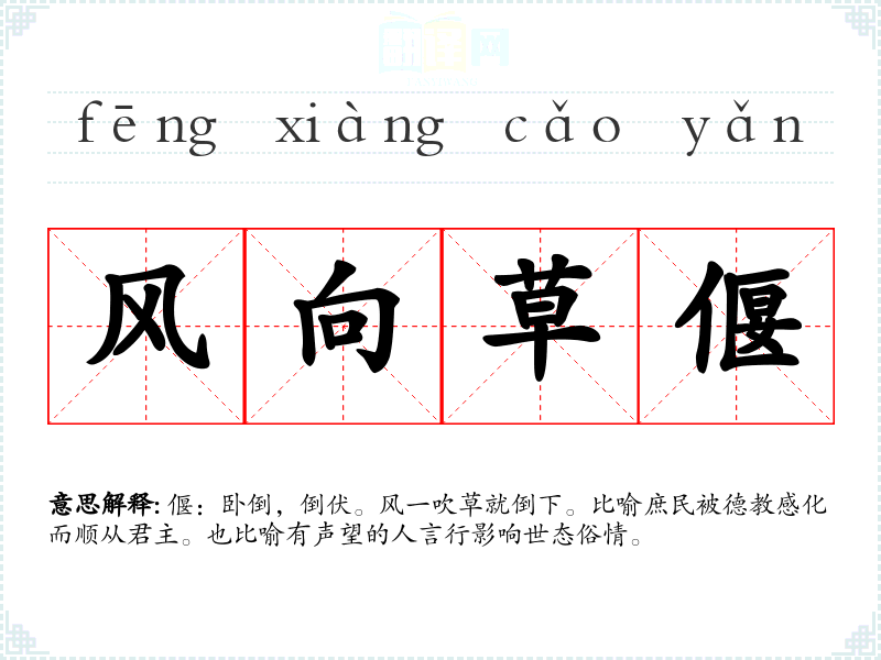 偃:卧倒,倒伏。风一吹草就倒下。比喻庶民被德教感化而顺从君主。也比喻有声望的人言行影响世态俗情。