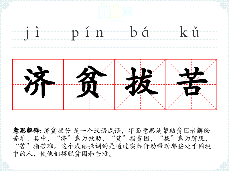 在传统文化中,济贫拔苦** 被视为一种高尚的道德行为,体现了儒家思想中的仁爱精神。在现代社会,这个成语也被用来讨论和评价政府的扶贫政策和社会福利制度。